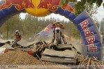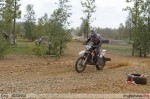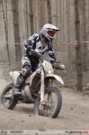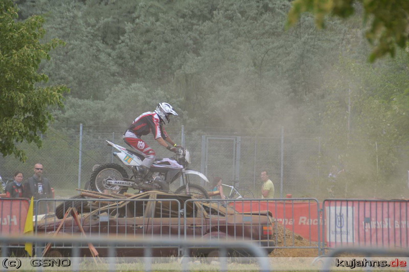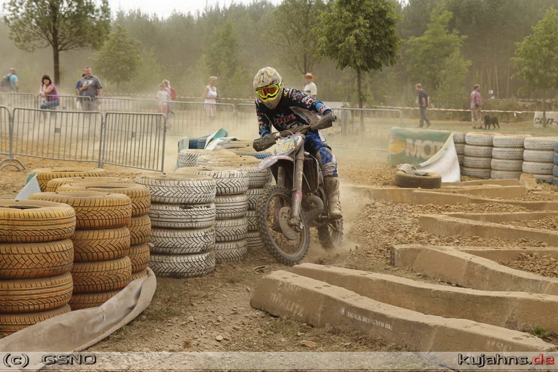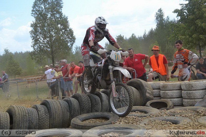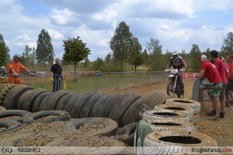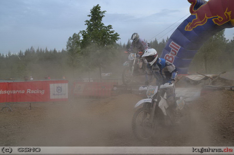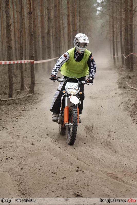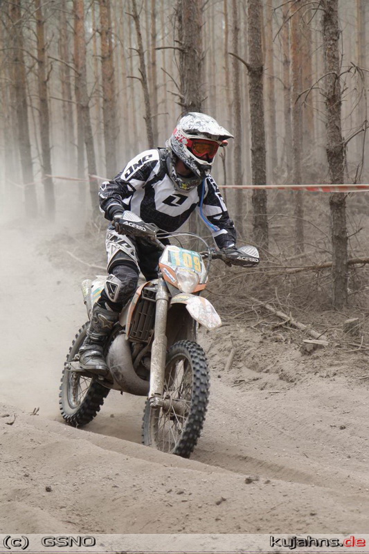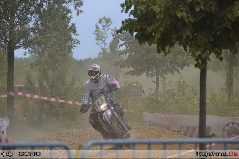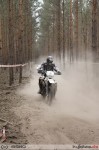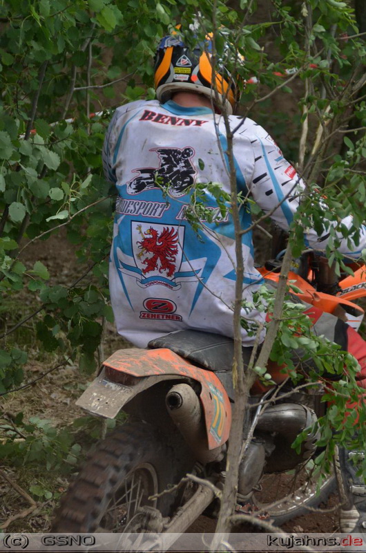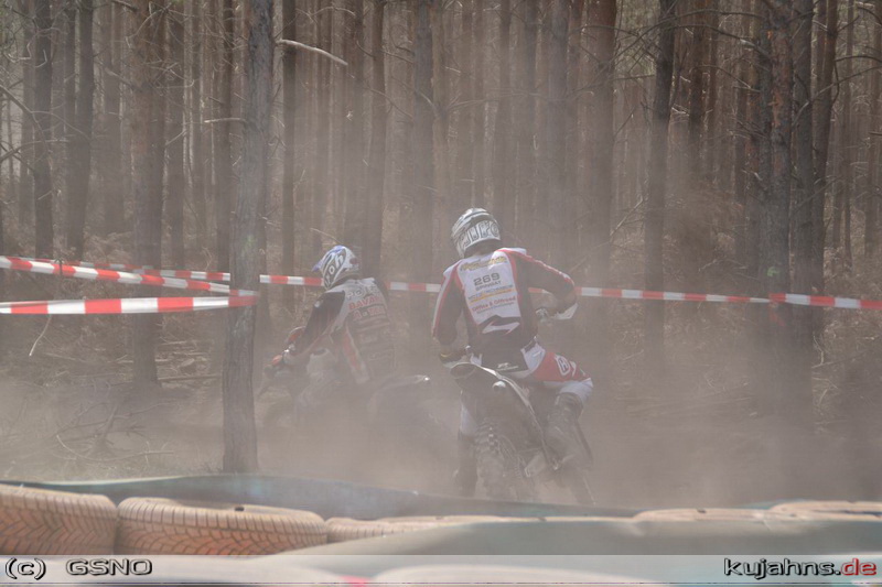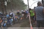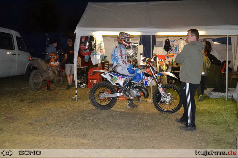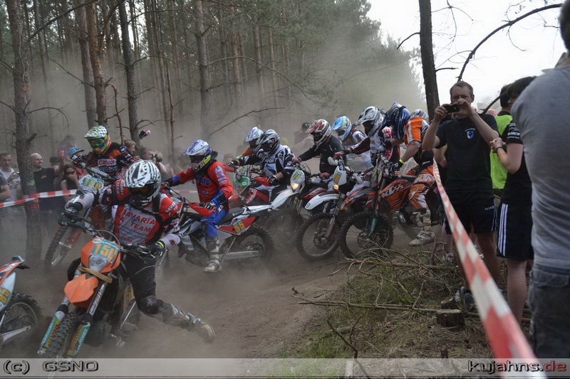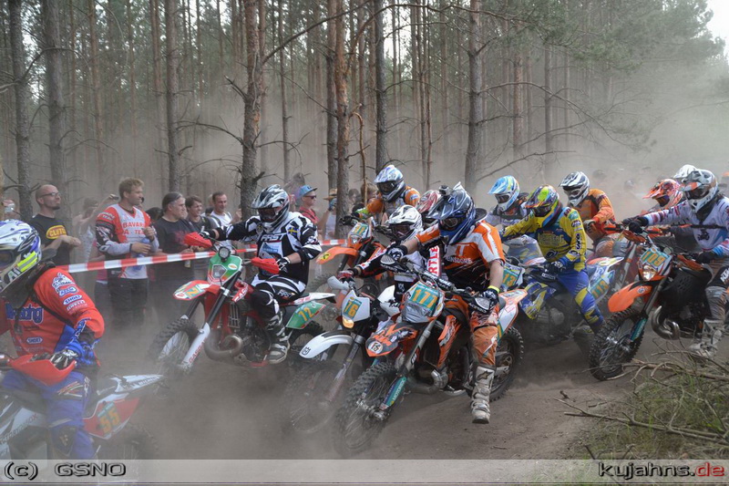 Ebenso war die Einstellung der anderen drei Teams. Nach den üblichen Vorbereitungen (Fahrerlager beziehen, die Strecke abgehen, Grillen, die erste Nacht verbringen, die technische Abnahme bestehen, die Boxen einrichten) rückte der Startzeitpunkt um 17°° Uhr schnell näher. Es versprach ein recht packender Beginn zu werden, da sich in diesem Jahr die gesamte Meute von der Straße aus im Pulk auf die erste, den Durchlass stark einschränkende Kurve in den Wald stürzen sollte. Nachdem der letzte warmgelaufene Motor vor der Startline verstummte, kehrte wieder die typische Stille ein und tausend Augenpaare der Fahrer und Zuschauer waren auf das Anweisungsschild des Starters gerichtet. Dann wummerte das Herzpochen des Startmusiktrailers los, welches scheinbar kaum jenes der Fahrer zu übertönen vermochte. Gefühlt ewige Sekunden vergingen, bis sich das Grollen erhob und sich die Enduro-Herde den Weg in den trockenen Kiefernwald schlug, nur aufgehalten durch das Nadelöhr der ersten Kurve. Schon nach den ersten Metern wurde klar, was die Piloten in ihrer Startrunde erwartete – der in der Schlagzeile erwähnte Staub und davon nicht nur ein bisschen sondern soviel und so dicht, dass die angesprochenen 10 Meter Sicht wohl noch deutlich übertrieben sind. Trotz einiger Null-Sicht-Stürze und -verfahrer haben wohl alle mehr oder weniger gut die ersten 13 km überstanden.