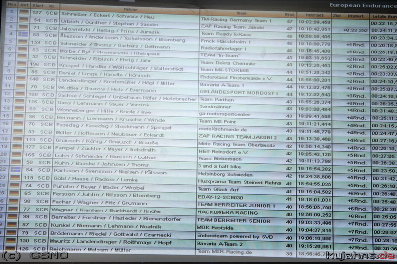 Das erste GSNO-Team #70 mit Stefan, Ben, Benedikt und Andreas belegte einen sagenhaften 10. Platz, nicht sehr entfernt gefolgt von unserem Team #76 motoXschmiede.de auf dem 17. Das zweite Team der Nordostler #109 mit Andre, Thomas, Olli und Sven-Uwe (dem Gastfahrer aus der Demminer Ecke) kam – durch eine Ungeschicktheit eines der Fahrer nur zu dritt unterwegs – trotzdem noch auf einem bemerkenswerten 37. Rang ins Ziel, gefolgt vom Nachwuchsteam #73 mit Frank, Raik, Jan und Sven auf dem beachtlichen 75. Platz.