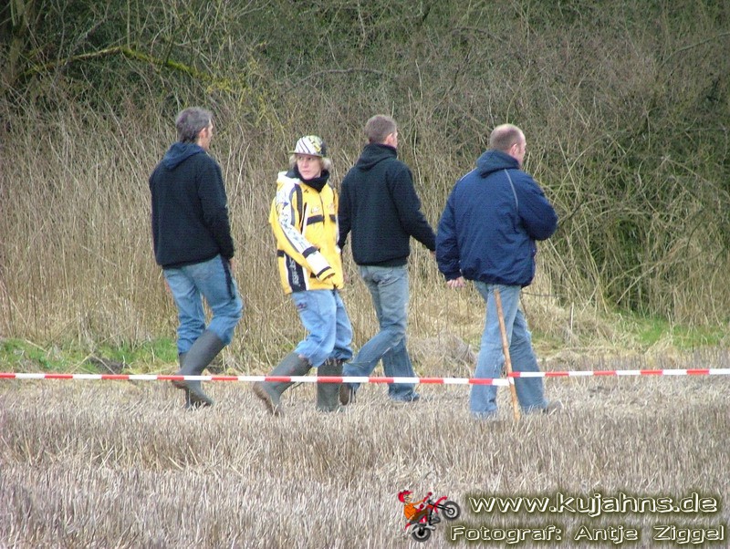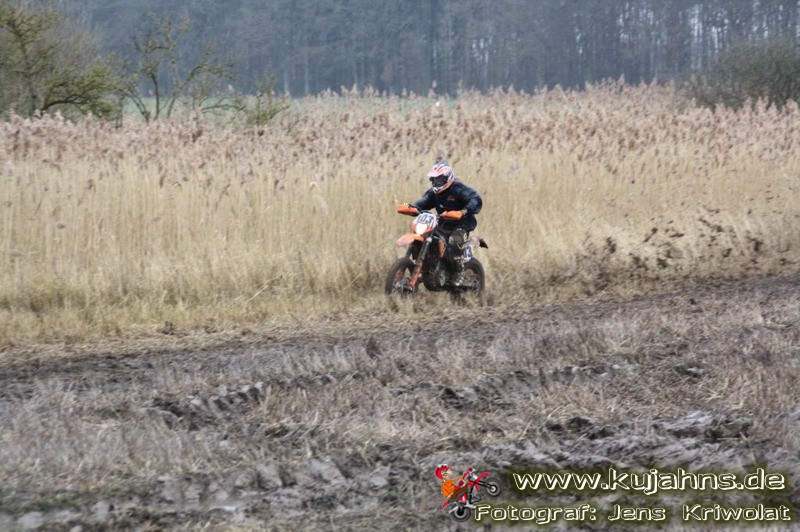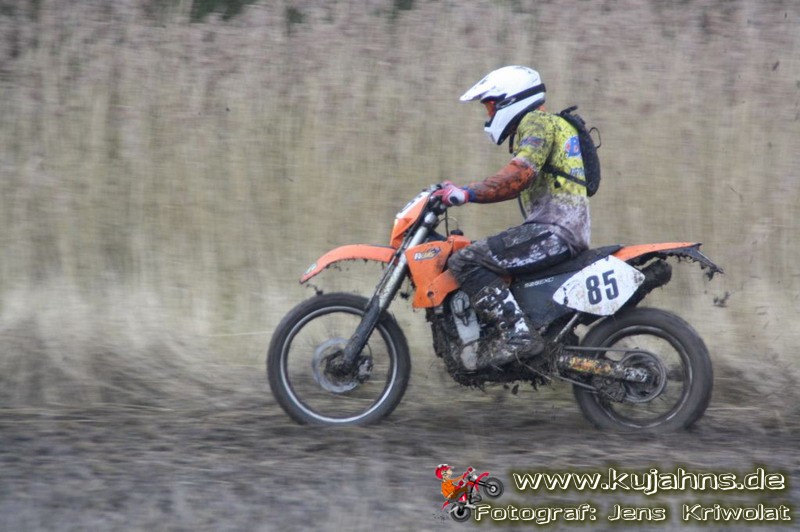 Rehna: Das Endurofahren nicht unbedingt an Schönwetter gebunden ist, wurde beim Auftakt zur Landesmeisterschaft in Mecklenburg-Vorpommern wieder einmal deutlich, denn pünktlich zum Beginn der bereits zum 55. Mal ausgetragenen Fahrt „Rund um Rehna“ setzte der Regen ein und die ganze Angelegenheit wurde zu einer Schlammschlacht. Es war nicht nur Schwerstarbeit für die Fahrtteilnehmer, auch das Wettkampfbüro musste bei der Auswertung der größtenteils total verdreckten Kontrollkarten alles geben.  Von den 153 Fahrern musste einige der insgesamt 39 Ausgefallenen bereits zur Halbzeit die Segel streichen.  Selbst für die gestandenen Endurofahrer war das vorgegebene Zeitlimit von 90 Minuten für jede der beiden Runden eine schwierige Hürde. Unter den Teilnehmern war auch der für Kuhstorf startende Profiboxtrainer Michael Timm von Universum Boxpromotion Hamburg, der beweisen wollte, dass er das KTM-Basecap in der Ringecke bei der Betreuung seiner Weltmeister nicht nur zur Show trägt. Mit den Besten konnte er jedoch bei weitem nicht mithalten, aber er zeigte zumindest Kampfgeist, in dem er, wenn auch mit Zeitüberschreitungen bis zum Schluß durchhielt und in der Wertung blieb. Der Championatsmeister des Vorjahres, Arne Domeyer vom MC Rehna, war mal wieder eine Klasse für sich und zum zwölften Mal in Folge bei einem LM-Lauf nicht zu bezwingen. Domeyer, der in seiner 250 ccm-4-Takt-Klasse auch bei der Deutschen Meisterschaft in Führung liegt, verzichtet bei der LM auf eine Wertung in dieser Klasse und punktet nur für die Championats- sowie dieTeamwertung. „Ich möchte anderen Fahrern die Meisterschaftschance geben, aber gleichfalls nicht auf die sechs Läufe in M-V als Vorbereitung für meine DM-Starts verzichten,“ beschrieb der Kaltenkirchener seine Moltivation.