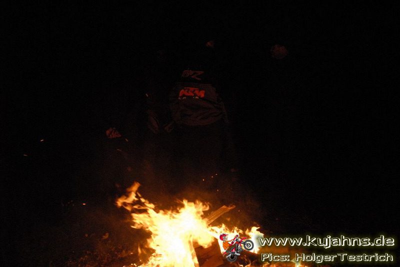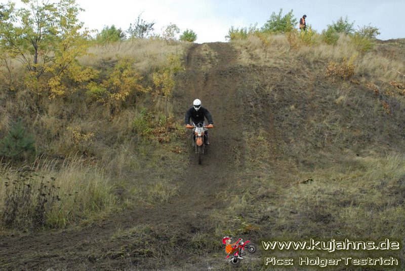 13.00 Start und los ! Start mal wieder völlig vergeigt ! 250“ springt nich an! Passiert mir fasst jedes mal… Dann lief sie endlich und ab gings auf die Strecke. Gleich rüber über diverse Strassenlaternen (da hangen schon die ersten!) dann weiter mit schönem Singletrack durch den Berg, ab und an auf die Crossbahn, weiter über nen Steinfeld, dann auch wieder die obligatorische Wolgaster Streuselschnecke, kleine Auf und Abfahrten in der Kieskuhle, dann weiter kreuz und quer über die Plantage, die Betonplatten, Bäume, dann ab Stiefelwaschen in den saftig gefüllten Klärbecken, dann wieder schöne fluffige Kurven und matschige Wies`n…wieder zurück auf die Crossbahn, mit ihren 2 etwas längeren und lehmigeren Auffahrten ! Da hiess es einfach HAHN AUF ! Meine 250` is immer oben angekommen……..MT32 sei dank ;-) …