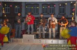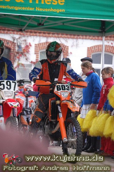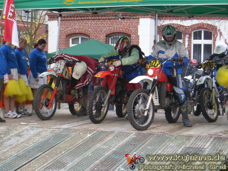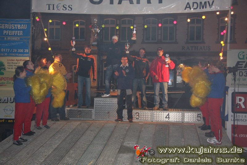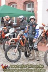 Wo war ich – ach ja, das Starterfeld … Das ist ja in W-dorf immer so zusammengestellt, dass zwischen die 30 Führenden des LM-MV-Championats das ein oder andere Tripel Wolterdorfer Clubsportfahrer gemischt wird und danach dann klassenunabhängig nach Nennungseingang das Moped auf die Startrampe geschoben werden darf. Da werden dann schon mal Stimmen laut, die es bemängeln, dass Top-Fahrer der LM-Berlin-Brandenburg recht stiefmütterlich behandelt und erst im hinteren Feld auf den Kurs geschickt werden. Naja – genauso freuen sich die MV-Leute, für die die Auffahrten in den Sonderprüfungen keine all zu große fahrerische Herausforderung darstellen, nicht unbedingt, wenn ein nicht so erfahrener Clubsportler auf den engen Trails vor ihnen quer am Berg liegt. So hat jeder seine kleinen Kritikpunkte, und vielleicht reagiert der Veranstalter ja auch mit einer geordneten Startfolge darauf – erst LM-BB Championat, dann die Top 30 aus MV und im darauf folgenden Jahr umgekehrt, oder so … Wen irgendwas gestört hat, konnte ja diesmal sogar ein kleines Umfragekärtchen ausfüllen, damit es die Frauen und Mannen um Wolfgang Buske und Harald Täger im nächsten Jahr noch besser machen können. Ich muss leider gestehen, dass mein gelber Zettel noch jungfräulich im Programmheft liegt, aber ich gebe ihn ja hier quasi nachträglich in ausführlicher Form zu Protokoll. :o) Alles, was man vom Vorstartablauf von Wolterdorf kennt, wie Parkplatzverteilung, Anmeldung, technische Abnahme, Park-Fermé, Tankzoneneinrichtung an der Feuerwehr und die mit bunten Lichterketten geschmückte Startrampe auf dem mit Sponsorenplakaten reichlich bedachten Marktplatz war in gewohnt bester Ausführung vorhanden. Neu war lediglich, dass der Motorensound beim Lichtchek der TA diesmal noch satter klang (natürlich nur bei den 4-Taktern … 2-Takter dengeln da nur noch nerviger … bis auf Björn Feldts CR500 vielleicht ;o), denn diese fand in der Tiefgarage unter dem Plusparkplatz und nicht, wie in den letzten Jahren, bei den Schienenfahrzeugen statt. Für die zweite Neuerung gibt’s (wahrscheinlich nicht nur von mir) einen großen Pluspunkt, denn es wurden zwei Mann abgestellt, die vor dem Start und, was noch viel wichtiger war, nach jeder Runde dafür sorgten, dass die Fahrer geordnet zur ZK kamen, um ihre Fahrerkarten abzugeben. Jeder hat bestimmt noch die Drängelszenen der zurückliegenden Veranstaltungen vor Augen, wo man sich schon fast kämpferisch die richtige Stempelminute verdienen musste, auch wenn man rechtzeitig die jeweilige Runde beendete. In diesem Jahr hat es, dank der beiden Herren, super geklappt – Daumen hoch dafür.