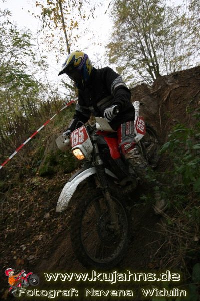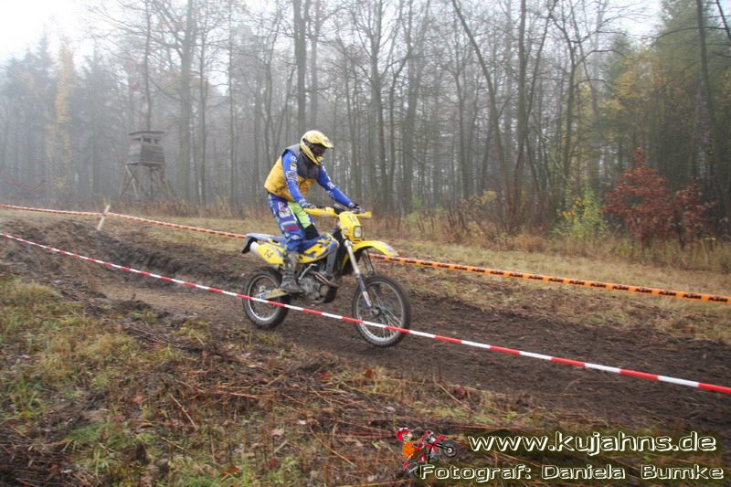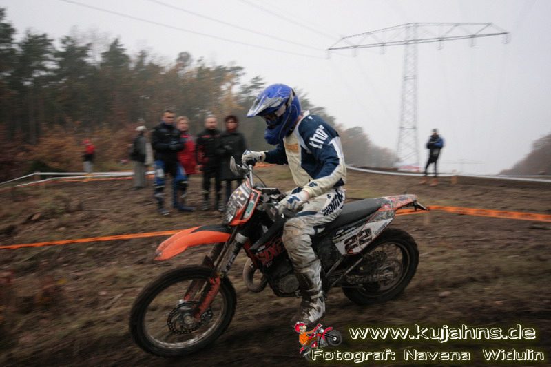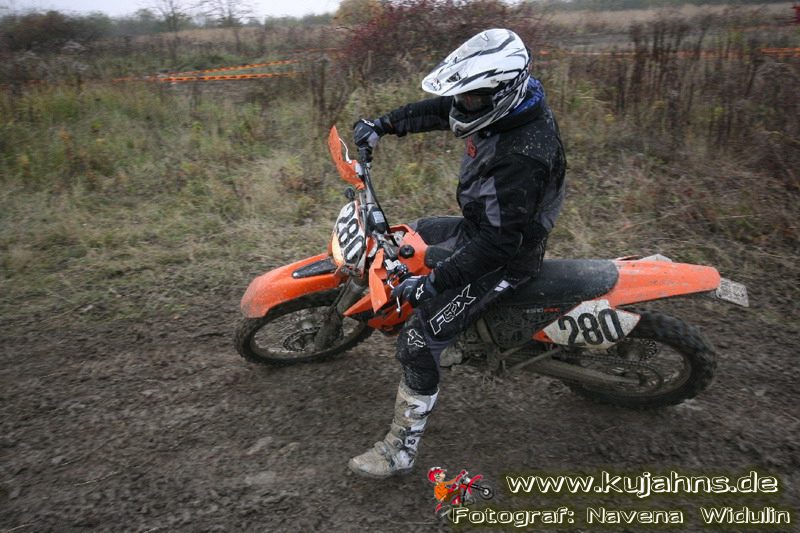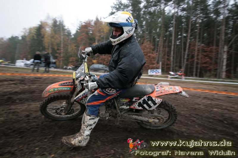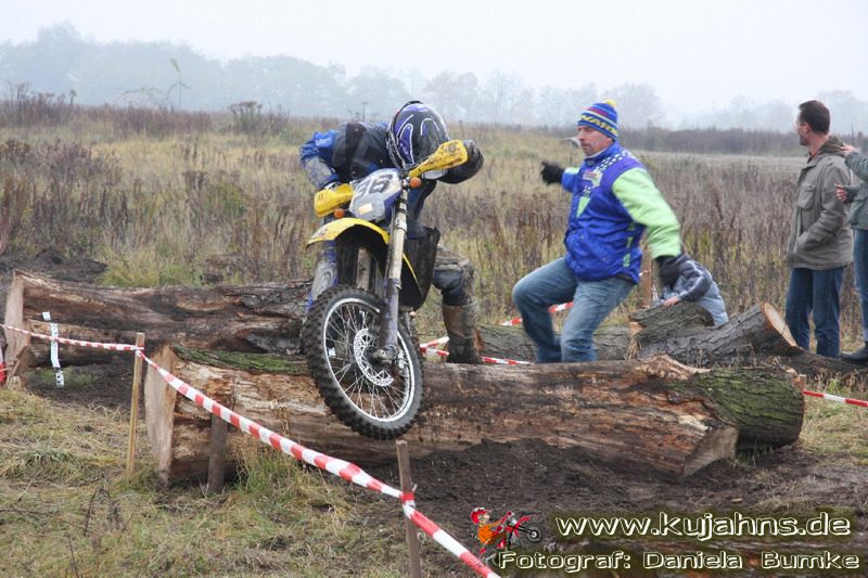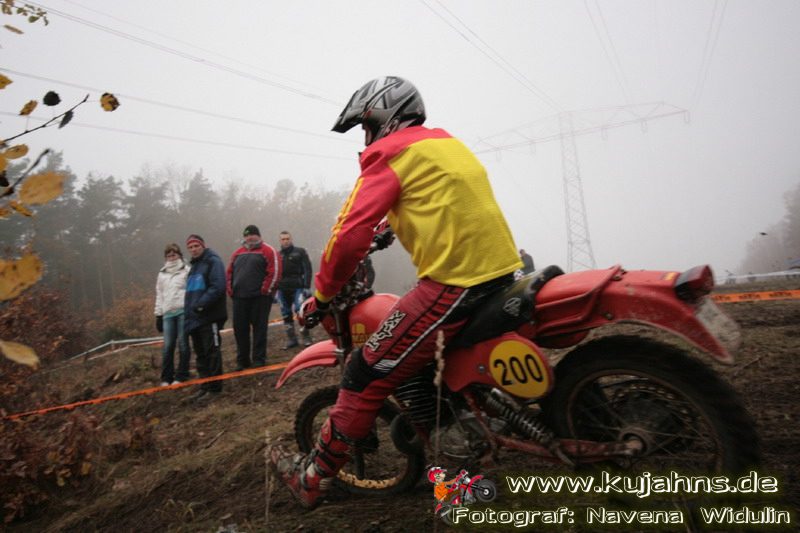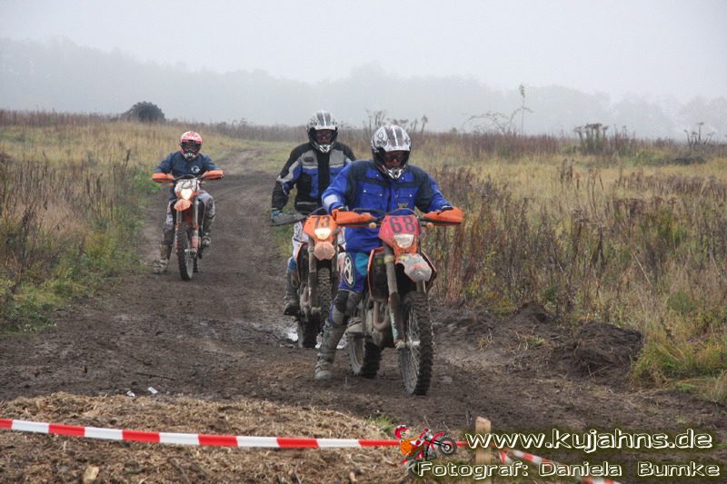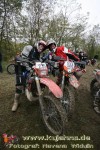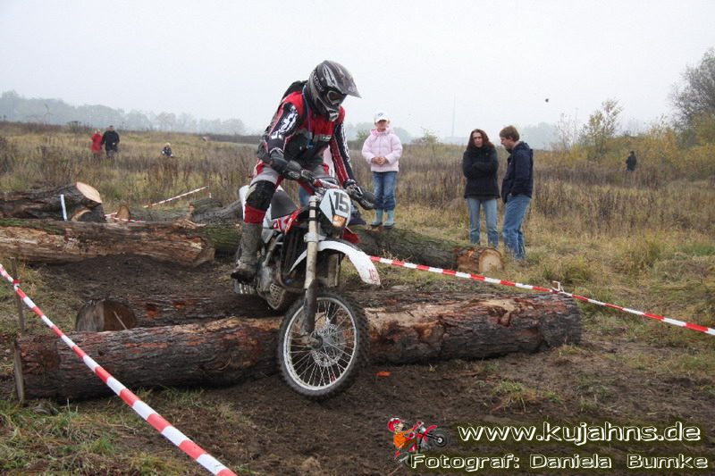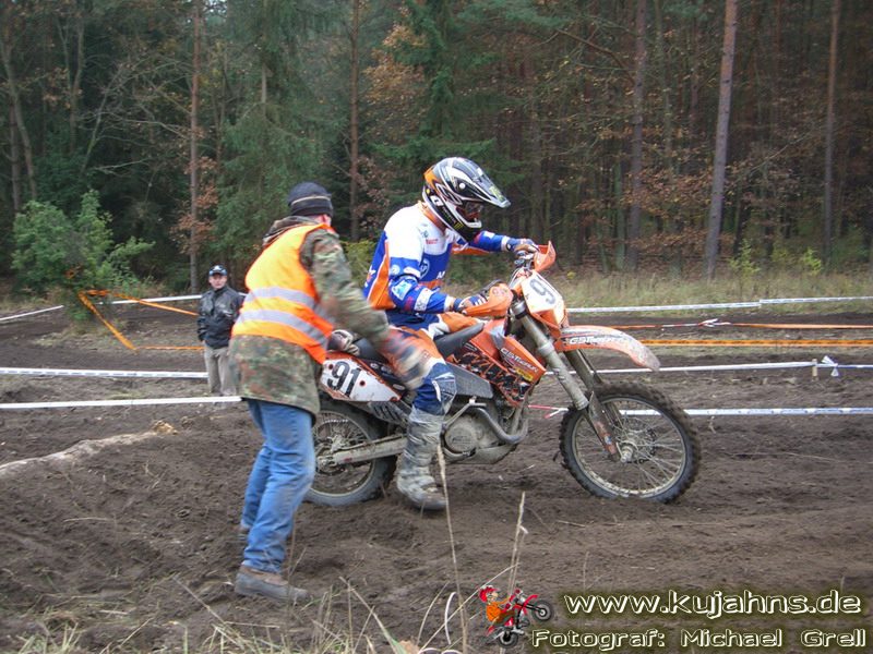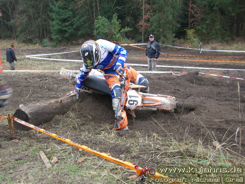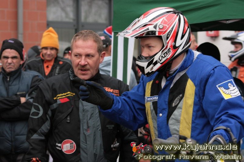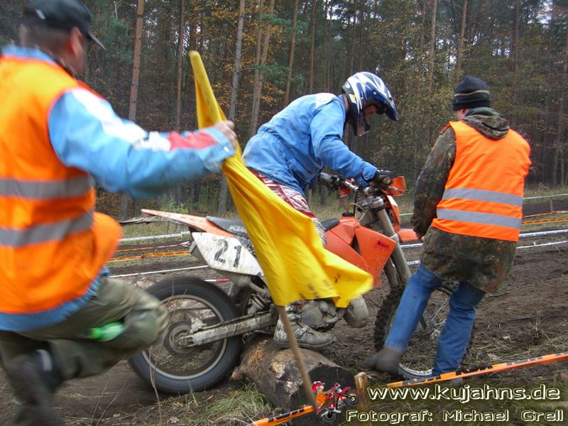 Dem Ruf des gelblich grauen, von Schotter und Steinplatten durchsetzten Matsches des Rüdersdorfer Tagebaus folgten wieder mehr Offraod-Entusiasten, als die 45 Kilometer lange Runde verkraften kann. Da halfen auch Negativ-Wetterprognosen und Thomas Hoffmanns Einschüchterungsversuche in seinem Vorbericht mit Aussagen wie: „Ihr werdet eure Absolution erfahren“ oder „harte Unterarme vor SP-1 sind garantiert“ nichts. Im Gegenteil – wenn vielleicht auch der kleine Fiffi einiger eher dem MX Verschriebener zu einem ausgewachsenen inneren Schweinehund mutiert, der sein „Herrchen“ lieber auf dem Fernsehsessel sieht, wird der wahre Endurist durch solch kühne Behauptungen erst so richtig aufmerksam und seine Vorfreude auf die Veranstaltung steigt ins Unkontrollierbare – da wirken auch Bilder „zufällig“ rudelweise auf einer Wiese umgekippter, dicker Bäume nicht abschreckend. ;o) Von vielen Spätentschlossenen musste die Nennung also zurückgewiesen werden und sie konnten sich höchstens vor Gram im geheizten Heim verkriechen oder am Renntag unter die Zuschauer mischen, was dann auch einige taten. Trotzdem waren es wieder einmal mehr als 200 Starter, die mit dem Event ihre Geländefahrerseele für diese Saison doch noch ins Gleichgewicht bringen konnten, denn leider waren es in diesem Jahr nach dem Aus beim MC-Kuhstorf insgesamt nur noch 5 LM-Läufe – da möchte man sich den Finallauf mit dem Ruf, DAS Rennen zu sein, auf keinen Fall untätig ansehen müssen oder hinterher einen Bericht lesen, bei dem man nicht zustimmend nicken und vor sich hin murmeln kann „Genauso ging’s mir auch“.