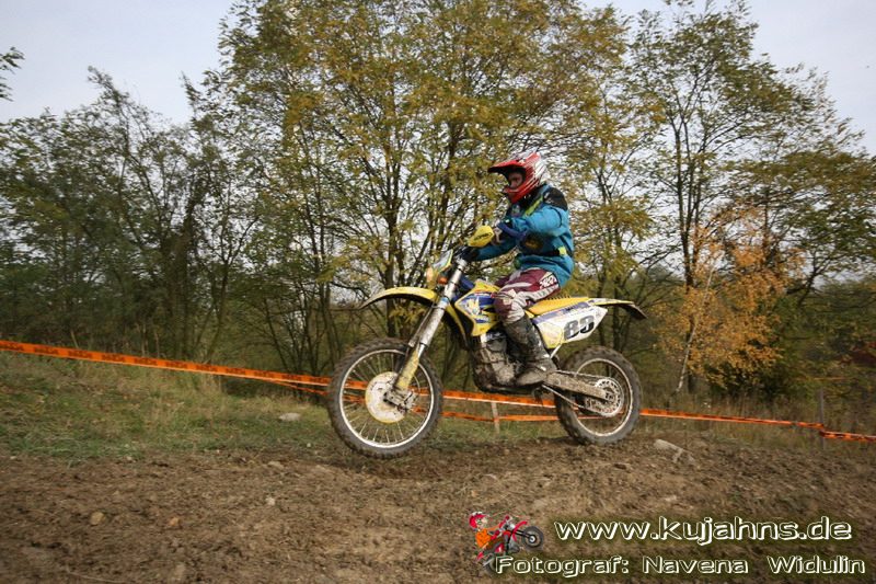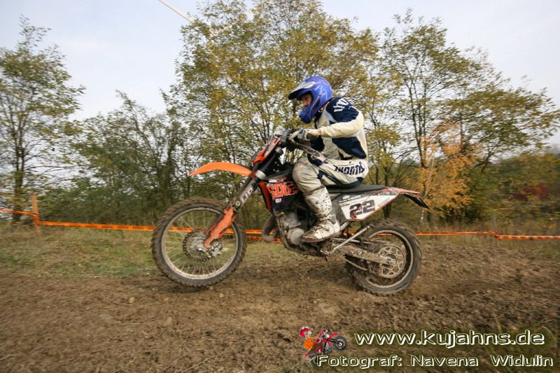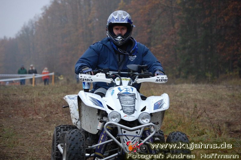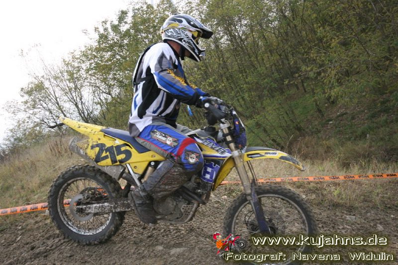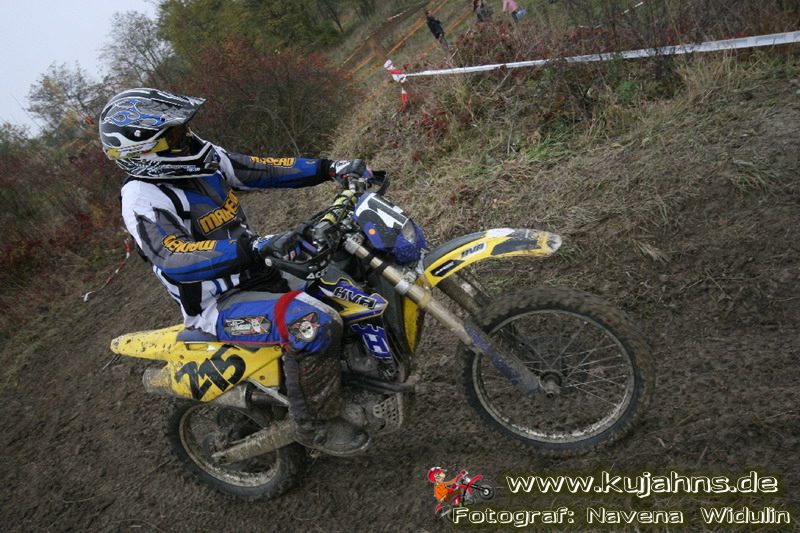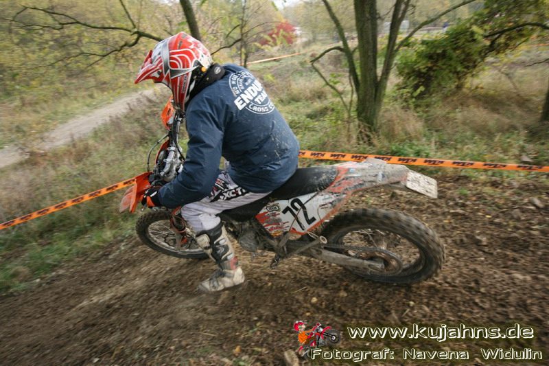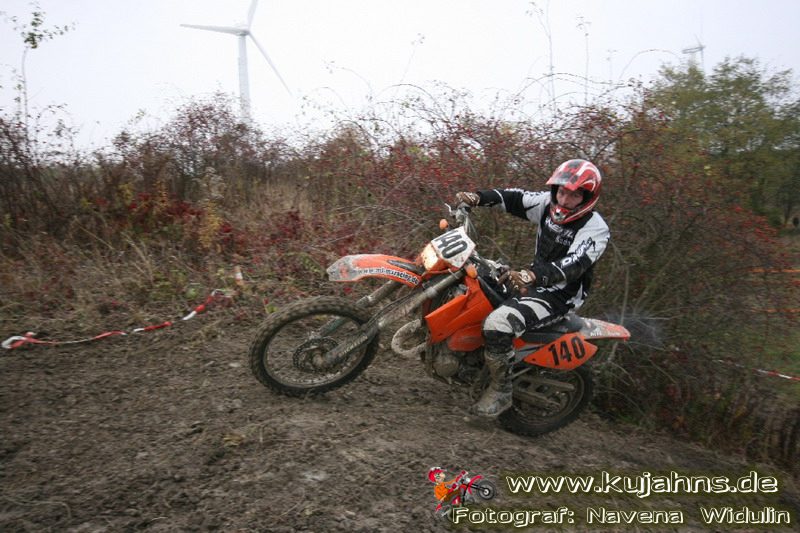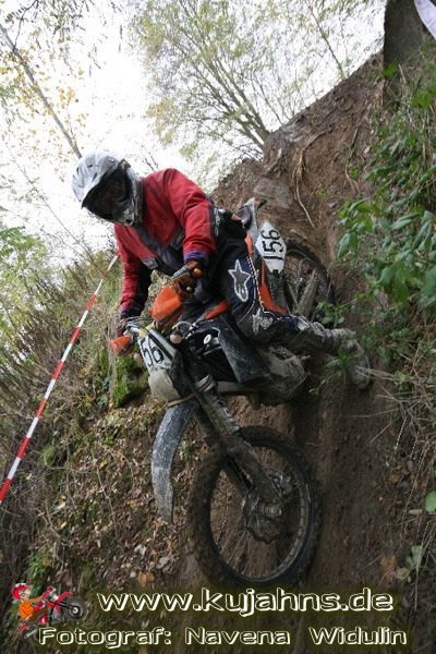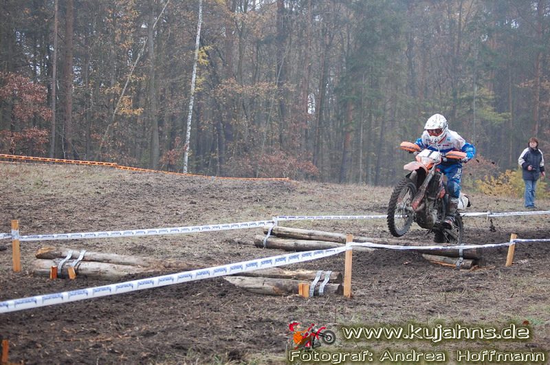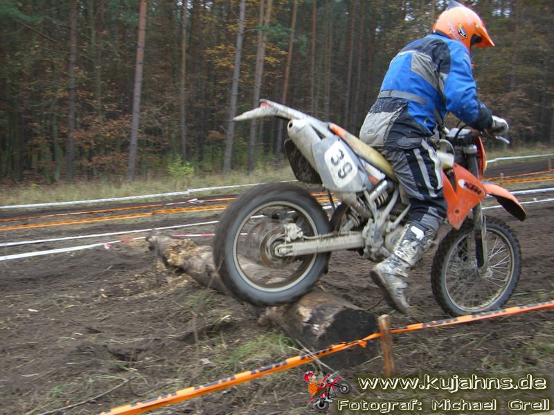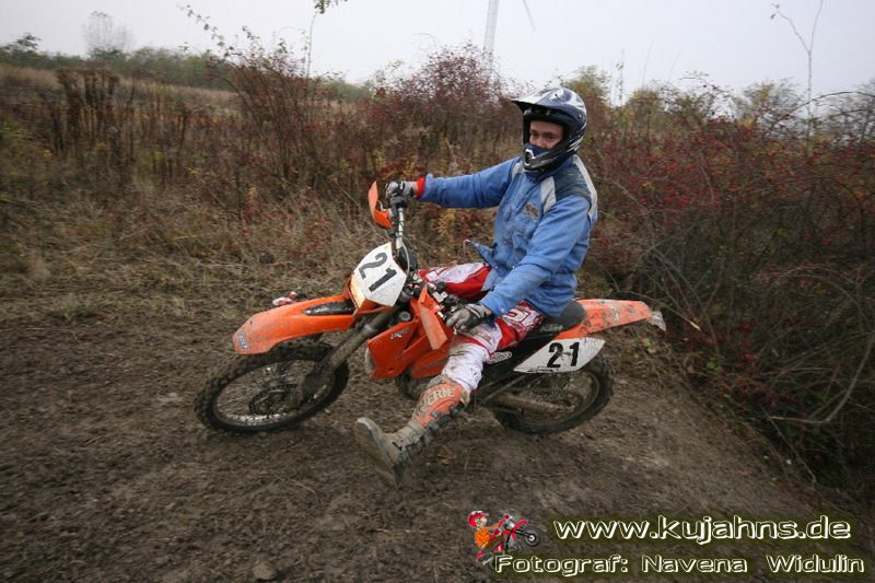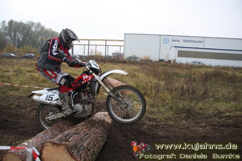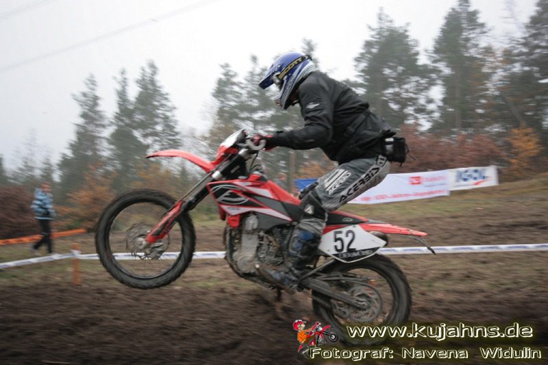 Dem Ruf des gelblich grauen, von Schotter und Steinplatten durchsetzten Matsches des Rüdersdorfer Tagebaus folgten wieder mehr Offraod-Entusiasten, als die 45 Kilometer lange Runde verkraften kann. Da halfen auch Negativ-Wetterprognosen und Thomas Hoffmanns Einschüchterungsversuche in seinem Vorbericht mit Aussagen wie: „Ihr werdet eure Absolution erfahren“ oder „harte Unterarme vor SP-1 sind garantiert“ nichts. Im Gegenteil – wenn vielleicht auch der kleine Fiffi einiger eher dem MX Verschriebener zu einem ausgewachsenen inneren Schweinehund mutiert, der sein „Herrchen“ lieber auf dem Fernsehsessel sieht, wird der wahre Endurist durch solch kühne Behauptungen erst so richtig aufmerksam und seine Vorfreude auf die Veranstaltung steigt ins Unkontrollierbare – da wirken auch Bilder „zufällig“ rudelweise auf einer Wiese umgekippter, dicker Bäume nicht abschreckend. ;o) Von vielen Spätentschlossenen musste die Nennung also zurückgewiesen werden und sie konnten sich höchstens vor Gram im geheizten Heim verkriechen oder am Renntag unter die Zuschauer mischen, was dann auch einige taten. Trotzdem waren es wieder einmal mehr als 200 Starter, die mit dem Event ihre Geländefahrerseele für diese Saison doch noch ins Gleichgewicht bringen konnten, denn leider waren es in diesem Jahr nach dem Aus beim MC-Kuhstorf insgesamt nur noch 5 LM-Läufe – da möchte man sich den Finallauf mit dem Ruf, DAS Rennen zu sein, auf keinen Fall untätig ansehen müssen oder hinterher einen Bericht lesen, bei dem man nicht zustimmend nicken und vor sich hin murmeln kann „Genauso ging’s mir auch“.