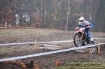 Nach dem Start, der, begleitet durch die Moderation von Jöran Hill, wieder von ehemaligen Fahrergrößen aus Polen sowie den Stadtoberhäuptern von Rüdersdorf und Woltersdorf vorgenommen wurde, kam man gleich auf jenes Stück Etappe, welches jeden Endurofahrer schon vor dem Rennbeginn mit einer schier unlösbaren Aufgabe bei der Bekleidungswahl konfrontiert. Denn es ist sehr schwer, die etwa sieben Kilometer bis hinter die Autobahnbrücke zu bewältigen, ohne das man friert, einem aber auf dem weiteren Kurs dennoch nicht der gesamte Saft aus den Poren schießt, was ja ab der zweiten Runde nur mit noch mehr Frösteln bei der Umrundung der zahlreichen Kreisverkehre (südwestdeutsch auch als Kreisel bezeichnet) verbunden wäre. Ich für meinen Teil reduziere diese Entscheidungsfindung immer darauf, dass ich ausnahmslos nur mit Fahrershirt, dem darunter befindlichen Brustpanzer sowie T-Shirt unterwegs bin. Ich habe dann einfach ein paar Faxen gemacht wie wippen, hin und her schaukeln, in die Hände klatschen und meine Husky in die Federn drücken. Damit bin ich bisher immer gut gefahren und hatte so auch keine Überhitzungsprobleme im richtigen Gelände. Hinter der Autobahn ging’s dann kreuz und quer durch das bekannte kleine Wäldchen und hin und her über den Straßenwall zu einer jeweils recht lustigen Auf- bzw. Abfahrt und noch ein paar schöne Singletrails entlang. Ich weiß nicht, ob sich die Streckenmonteure von der 1. Vorpommerschen Geländefahrt in den Nordost-Wäldern ermutigt fühlten oder ob es schon länger geplant war, aber es gab diesmal eine Menge Holz zu queren. Es waren nicht nur die beiden Baumstämme in der Sonderprüfung unter der Stromtrasse, die man ja früher sogar noch umfahren konnte, sondern die Fahrer wurden auch von drei Dreierbündeln und einem einzelnen Stamm kurz vor dem damaligen Bergabsprung angelacht, welche vorher als Streckenbegrenzung an den Auffahrten dienten. Ach ja – und dann waren da noch die drei Dicken Dinger aus Hoffis Vorbericht. Bei der Wahl des Stammdurchmessers sind bei den Streckendesignern garantiert die alten Trialfahrer-Gene wieder durchgekommen. :o) Als ich in der ersten Runde nach den erwähnten Singletrails darauf zukam, wuchtete bereits ein Fahrer seine Maschine rückwärts vom ersten Stamm runter. Das muss ihn so geschafft haben, dass die Streckenposten ein Einsehen hatten und ihn vorbei schieben ließen. Ich bin zwar nicht elfengleich aber dennoch ohne Probleme drüber gekommen und stand damit vor der ersten DK, der eine SP-ähnliche Wiesenschleifenprüfung folgte, auf der man schon mal seine Kurventechnik wiederbeleben konnte. Ist man früher von dort außer über ein paar kleine Grashügel recht geradlinig auf einigen Wiesenwegen zu den alten Gleisanlagen gelangt, folgten diesmal recht abwechslungsreich alte Klärbecken, deren Durchquerung viele ja schon im Oktober in WLG üben konnten, eine schmale Brücke über einen Wassergraben und eine enge Passage entlang eines schlammigen Ufers, welche allerdings nur die erste Runde durchhielt. Den Sand zwischen den Gleisen hab’ ich gemieden – so was haben wir hier oben genug – ich habe mich sehr darauf gefreut endlich mal wieder im 5.Gang über Bahnschwellen zu brettern – ein erhebendes Gefühl. Zwar hat es auf dem zweiten Stück vor den Wagons, die man auf der rechten Seite passierte, einmal mächtig gescheppert, da eine der Schwellen fehlte, die 0,9 Bar in meinen Reifen waren aber wohl ausreichend. Am Hinterrad eines Vereinskollegen ging dieses „kleine“ Schlagloch nicht ganz spurlos vorrüber – ist aber nur ´ne kleine Beule geworden. Nach den Sandwhoops rechts neben den alten Güterwagen ging’s dann wieder durch Stadtgebiet und links vor der Kirche über einige 100 Meter Kopfsteinpflaster sowie eine Abfahrt zum eingewöhnen zur DK2 und dem Herzstück der Runde, dem Rüdersdorfer Tagebau mit der Wertungsprüfung unter den Windrädern sowie dem umliegenden Gelände, welches zur wohl schwersten, jemals zu bezwingenden SP-Zufahrt hergerichtet wurde. Ich habe zwar vergeblich auf meine Absolution gewartet ;o) , fand es aber absolut genial und konnte gar nicht genug bekommen. Nicht nur aus diesem Grund wäre ich sehr gerne noch eine vierte Runde gefahren. Das mögen einige etwas anders gesehen haben. Zumindest die, welche die zahlreichen Einsätze der Streckenposten an den Auffahrten nötig machten oder jene, die den Baum an der Abfahrt direkt nach dem Ziel der SP seiner Rinde beraubten, als sie ihre Maschine unsanft an ihm einparkten. Ich hoffe, es hat dort keinen ernsthaft erwischt. Oder hat sich etwa der Pechvogel des Tages seinen Zeigefinger und Arm an dieser Stelle verbogen? Gute Besserung noch mal an dieser Stelle. In der Sonderprüfung gab’s dann eigentlich keine nennenswerten Überraschungen. Zum großen Teil war der Streckenverlauf aus den Vorjahren bekannt und auch schon gut eingefahren – oder waren die Spuren doch nicht alle von 2007 … so wie auch an der Stromtrasse? ;o)