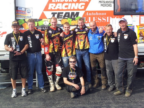 Tag 6 heisst Abschlusscross. Ein abgesteckter Rundkurs auf dem Sachsenring mit 50 Prozent Gelände und Strassenanteil, musste mit einer bestimmten Rundenzahl auf Zeit gefahren werden. Unsere Fahrer behielten auch dabei die Nerven und fuhren mit 22 Sekunden Vorsprung den innerdeutschen 3. Platz sicher nach Hause! International behaupteten wir ebenfalls unseren 15. Platz! Erwartungsgemäss wurde der sechste Fahrtag auch wieder zur französischen Paradevorstellung. Die Perfektion der Franzosen ist beeindruckend. Doch auch unsere deutschen Fahrer wurden auf einer Welle der Begeisterung durch den Sachsenring getragen. Christoph, Axel und Marcus genossen auch den letzten Fahrtag bei den ISDE 2012. Das Betreuerteam um Jörg, Ralf, Dietrich, Murat und Höffi genossen dann natürlich die Ankunft unsere Fahrer am Paddock.