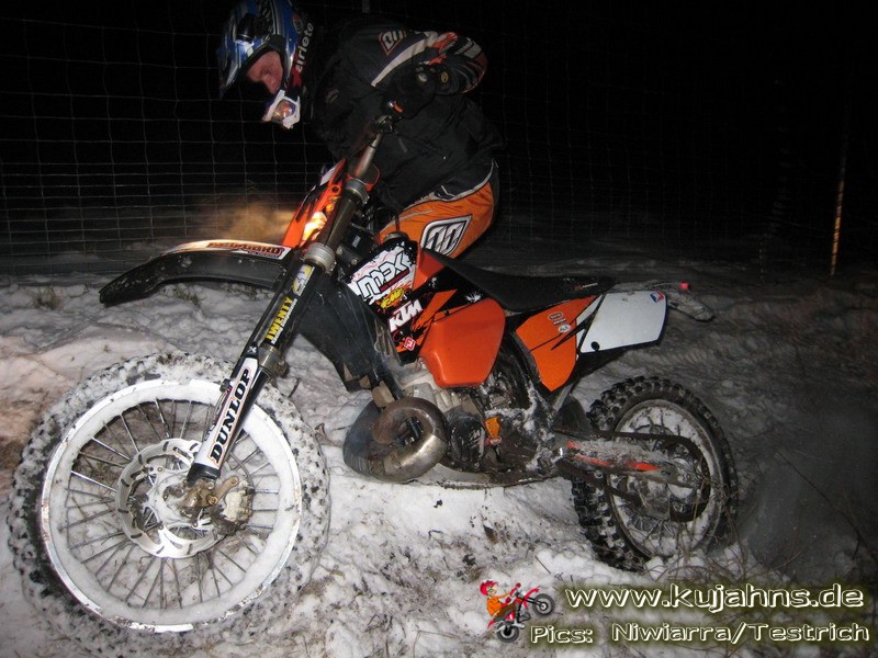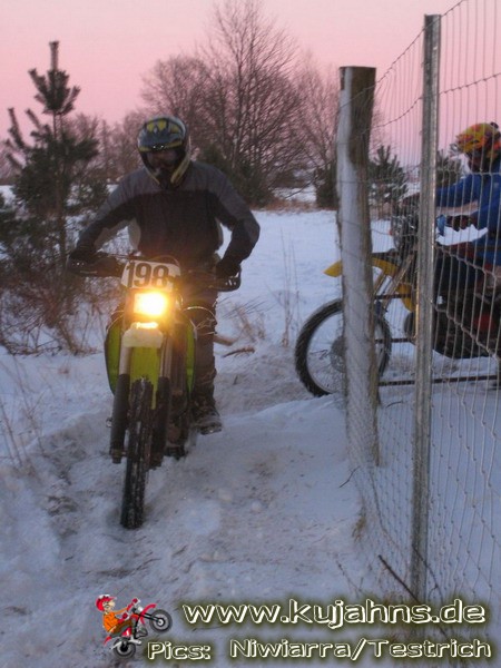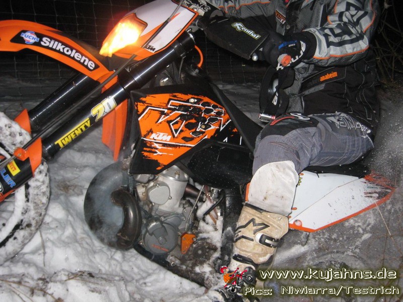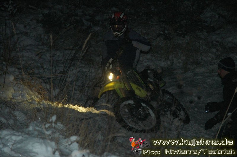 Thosty(218) hat dort die Beste Zeit von seinen vier Prüfungen gefahren, wie die meisten anderen Fahrer auch. Christoph Lessing(234) blieb Thosty immer auf den Fersen und Mario Grimm(215) immer ein Stück voraus, so auch im ganzen Rennverlauf. In den weiteren drei Runden wurde der Regen nicht weniger, und die Strecke dadurch auch nicht besser. Die Bahn wurde immer mehr ausgefahren, denn es mussten sich ja immerhin 300 Fahrer durch die Prüfung kämpfen. Darunter waren auch Quads und Seitenwagen. Zur späteren Zeit wurden Teile der Prüfung rausgenommen, da sie nicht mehr fahrbar waren. Thosty musste leider zweimal zu Boden gehen, dadurch war die Top Ten Platzierung hin. Beim zweiten Sturz überschlug er sich, er hatte eine Betonkante übersehen. Ihm ist nichts weiter passiert, aber sein Kotflügel brach ab. Mit Unterstützung von GST-Berlin wurde ein neuer Kotflügel beschafft. Am Ende hatte sich Mario Grimm den siebten, Thosty den dreizehnten und Christoph Lessing den sechzehnten Platz in der E3 gesichert. Thosty war mit sich und seiner Husaberg zufrieden.