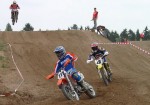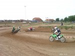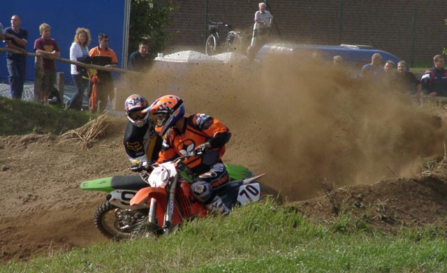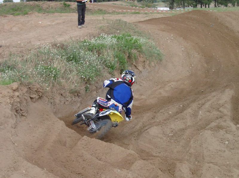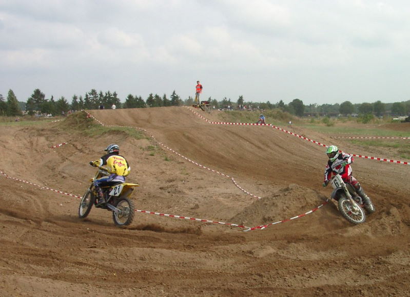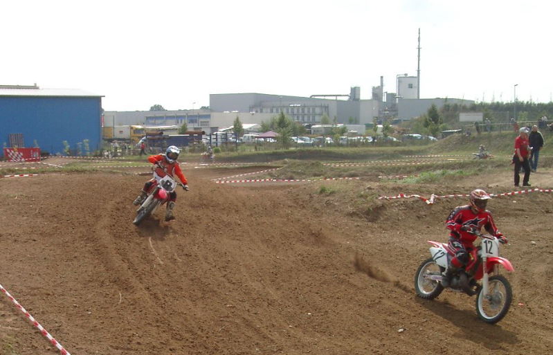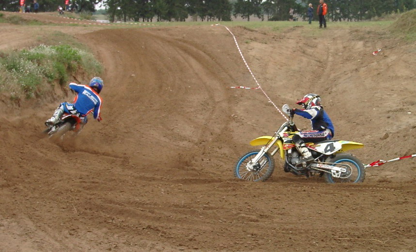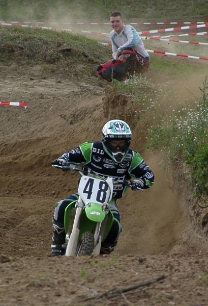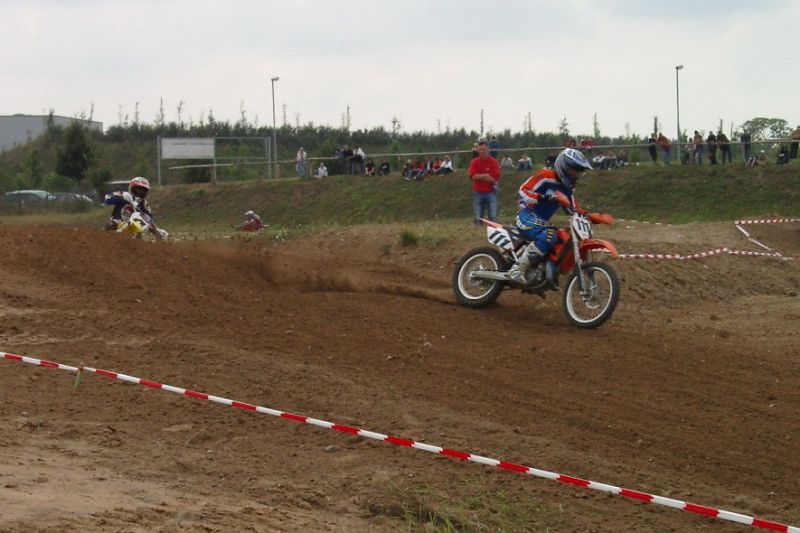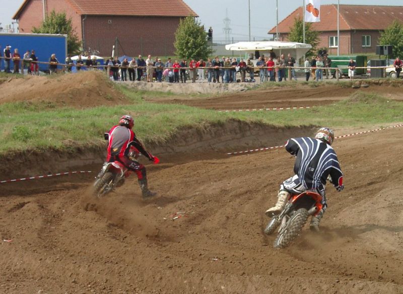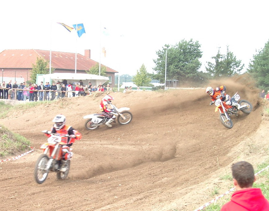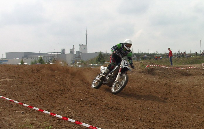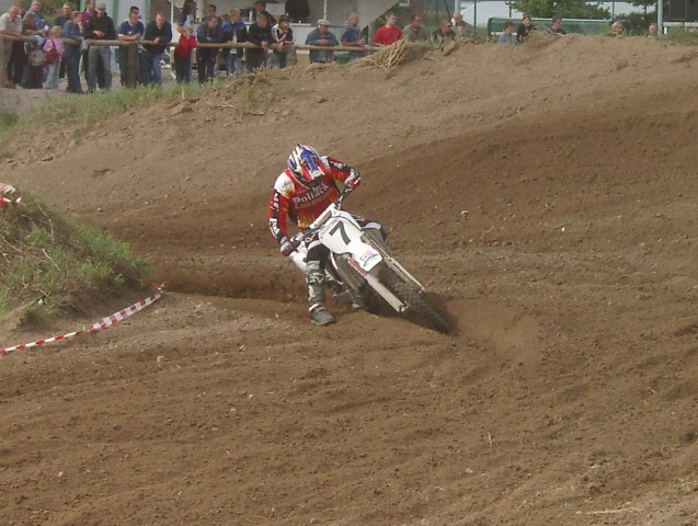 mich allerdings schon wieder rangekämpft und konnte auch locker vorbeiziehen und Land gewinnen. Und so war dann auch der Zieleinlauf. Der Start zu Heat #2 verlief genau gleich, nur dass Tom Krupke auch noch innen neben mir durchrutschte, und als ich dann zweiter war hatte Falko schon ein paar Meter Vorsprung. Ratz Fatz bin ich aber wieder ran- und vorbeigefahren. Aber natürlich (wie schon so oft in diesem Jahr) blieb das Glück nicht auf meiner Seite und ich bin dann noch mal hingeflogen. Ich bin zwar wieder ein Stück an Falko rangekommen, aber es hat am Ende nicht mehr gereicht. Meine Gabel hat im zweiten Lauf dank den vielen kleinen Wellen auch noch den „Headshake“ gemacht, weil ich mit einem ausgeborgtem rechten Gabelholm fahren musste (ich hab Freitag beim Reifenmonieren festgestellt, dass der Stoßdämpfer in meiner Gabel abgerissen war, und so hab ich noch schnell einen Gabelholm auftreiben können, damit ich wenigstens fahren konnte). Hinter Falko und mir war eigentlich überhaupt Nichts (außer Überrundete ;-)). Wir beide hätten im ersten Lauf fast den drittplatzierten Paul Glawe überrundet, denn Paul war sage und schreibe EINE MINUTE UND FÜNFZEHN SEKUNDEN hinter uns!!! Im zweiten Lauf war es so ähnlich. Das muss man sich mal durch den Kopf gehen lassen..... ;-))) Paul war übrigens in beiden Läufen dritter. Im Tagesergebnis hat Falko dann dank der Majorität der Besseren Plätze vor mir, Paul, Alexander Boese (der beide Läufe vierter wurde) und Florian Kummerow (7./5.) gewonnen.